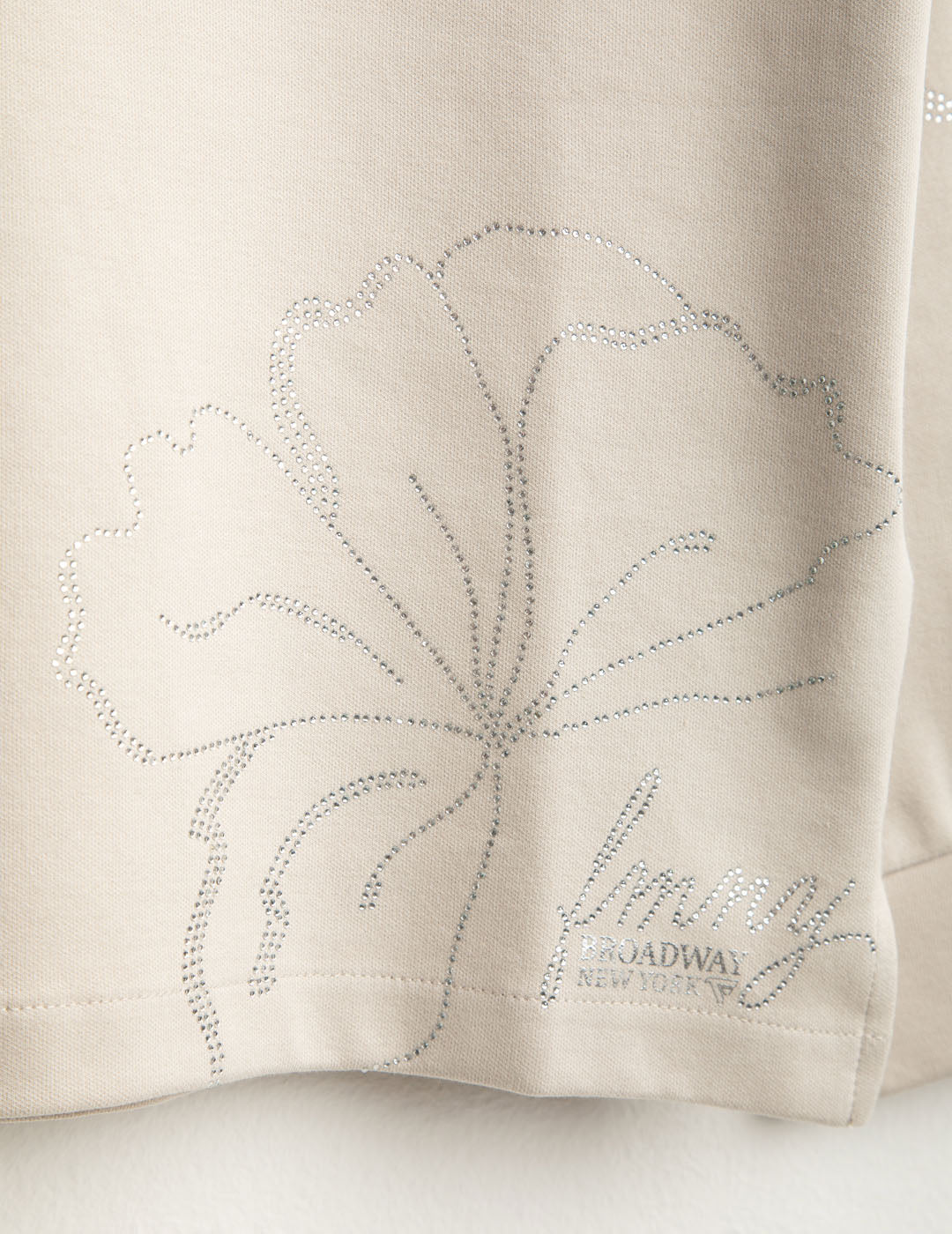 A soft interlock crew-neck sweatshirt enriched with lamé print lettering, rhinestones and floral decorations.