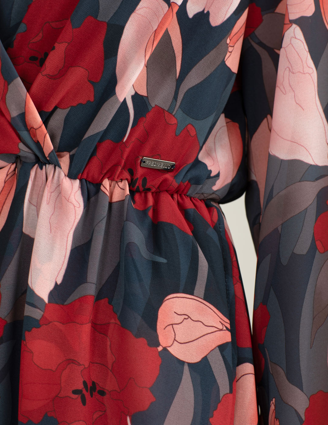 Un abito dal fascino femminile e contemporaneo, con scollo a V e incrocio sul corpetto e sulla gonna. La georgette leggera con stampa all-over e la placchetta metallica personalizzata lo rendono un capo distintivo per look curati e ricercati.
