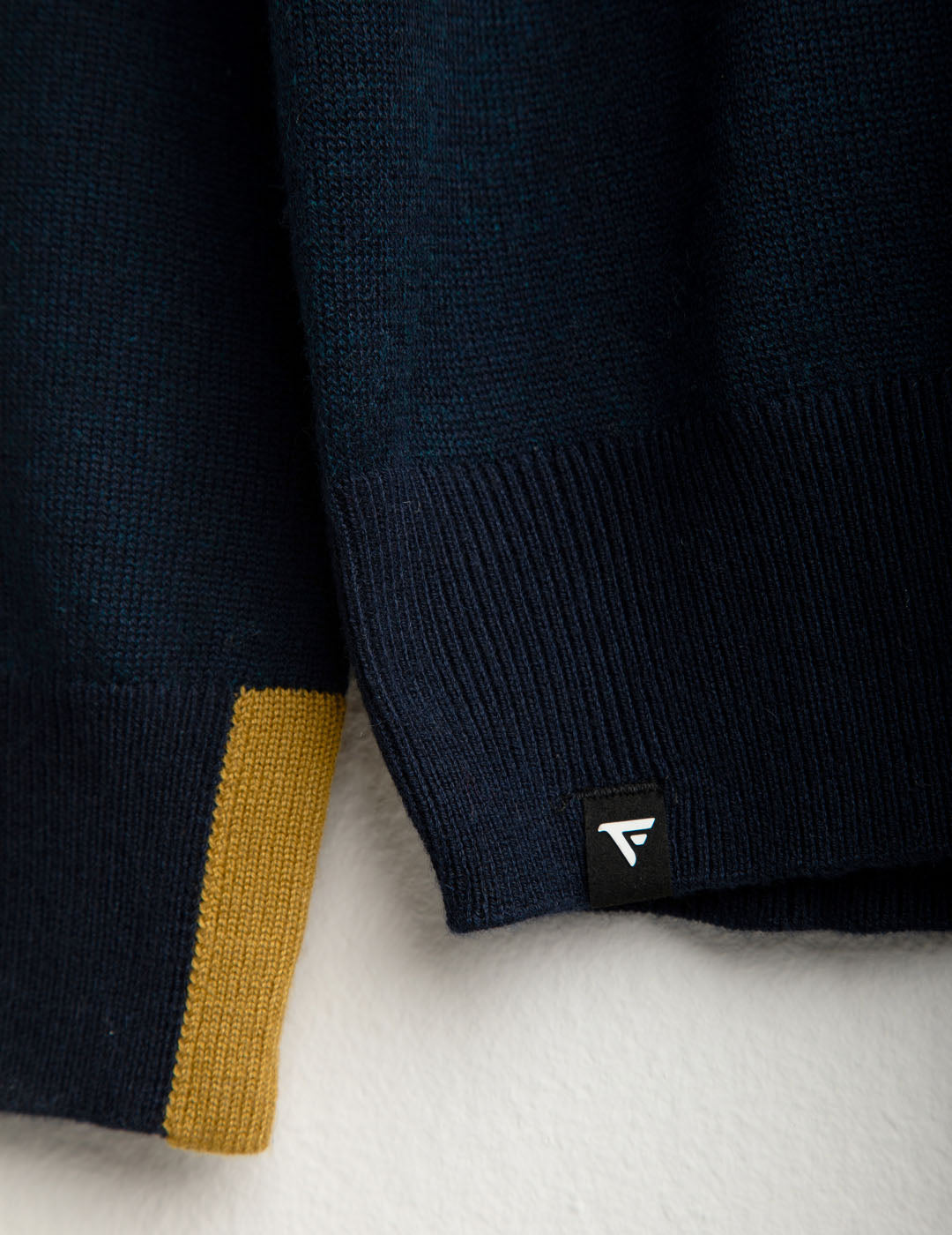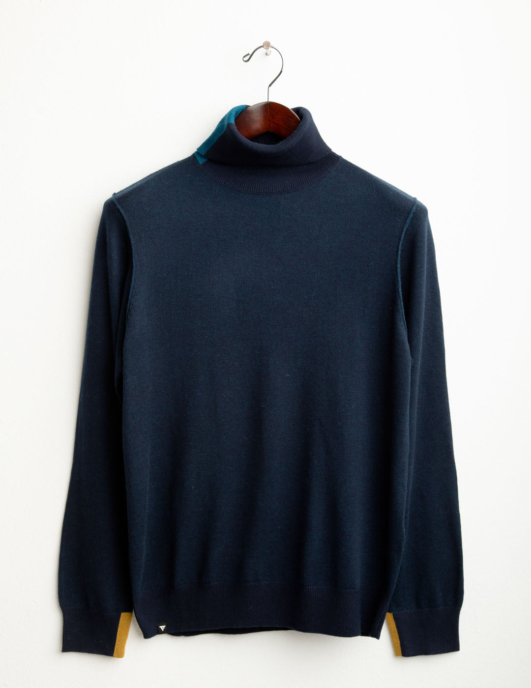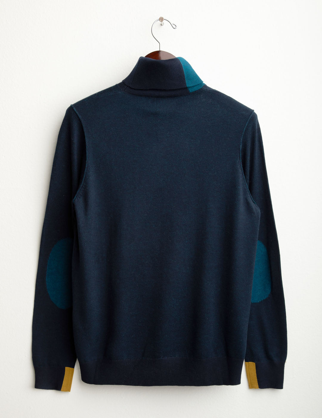 Una maglia dolcevita dal design ricercato, realizzata in filato misto lana finezza 12 con lavorazione vanisé. Le toppe in contrasto e i dettagli color block donano carattere a un capo caldo e versatile.