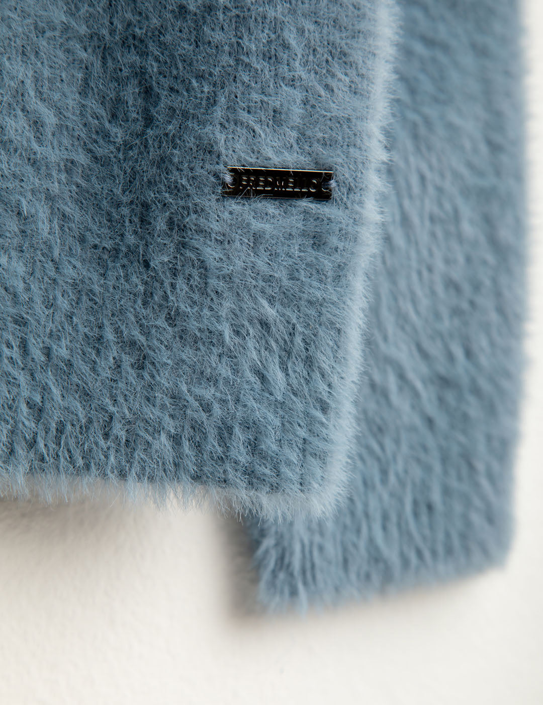 Una maglia morbida e calda, realizzata in filato effetto pelliccia e arricchita da placchetta metallica personalizzata.