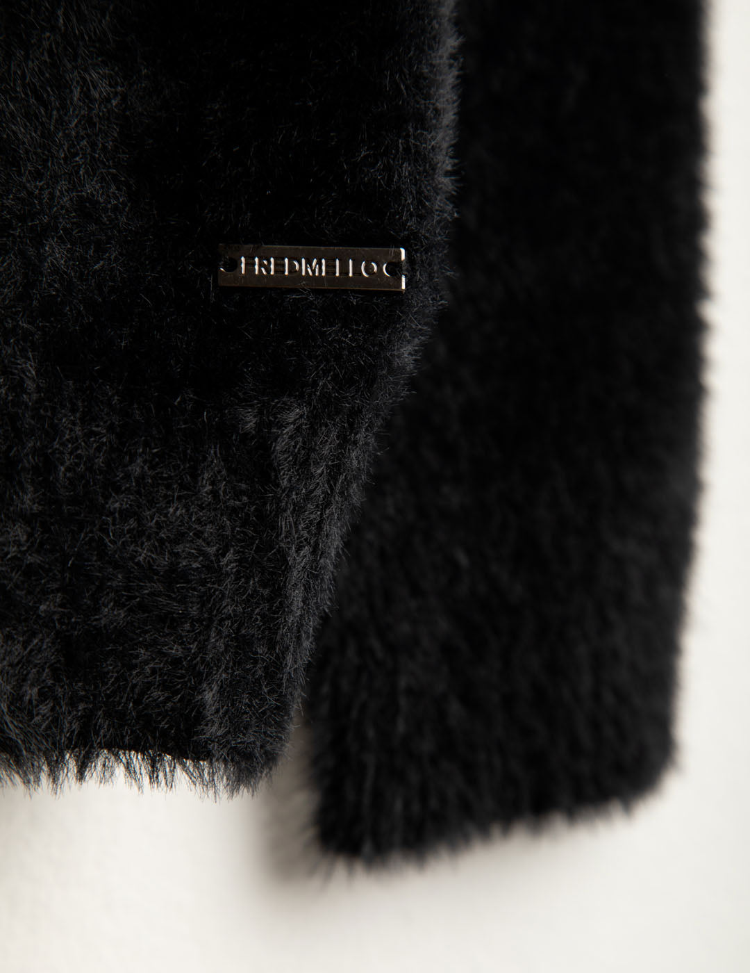 Una maglia morbida e calda, realizzata in filato effetto pelliccia e arricchita da placchetta metallica personalizzata.