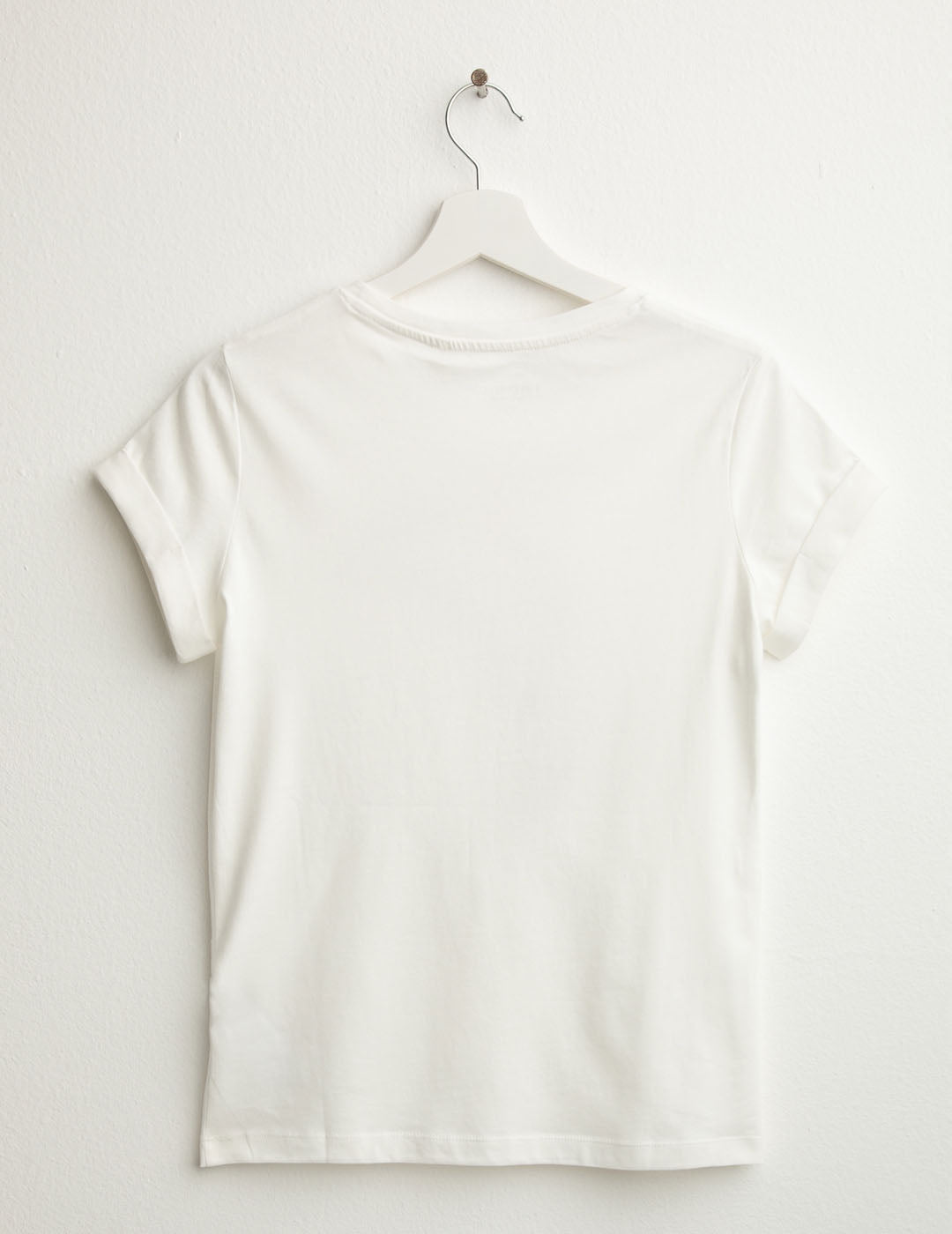 Una t-shirt dal carattere contemporaneo con micro-catenella ricamata e lettering in lamina. Perfetta per donare personalità e originalità agli outfit quotidiani.